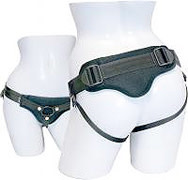 4-way adjustable harness fits up to 82" waist and 44" legs. Padded back support. Includes 3 interchangeable rubber o-rings (1.5" - 1.75" - and 2"). Accommodates any dildo with a flared base.