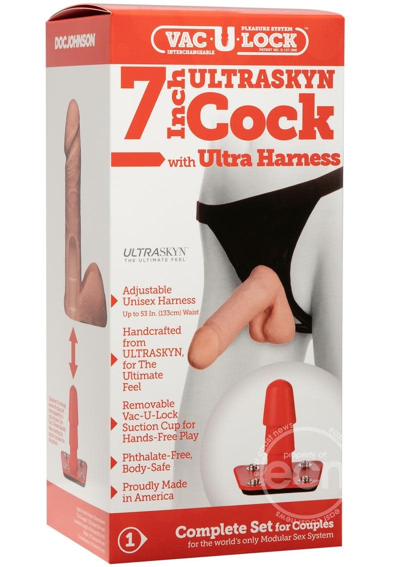 1 complete set for couples for the world's only Modular Sex System. Ultra Realistic Cock and Harness Set Securely strap on your harness then attach any of a selection of dildos. This harness has an adjustable waist up to 53 inches, an open crotch for maximum comfort, easy access and non-slip action. All designed to give you command and control for your erotic pleasures. Ultra Realistic Cock and Harness Set Securely strap on your harness then attach any of a selection of dildos. This harness has an adjustable an open crotch for maximum comfort, easy access, and non-slip action; all designed to give you command and control for your erotic pleasures. The Vac-U-Lock plugs attach with snaps. Vac-U-Lock Complete Set includes vinyl harness, 7 inches Ultraskyn attachment, Vac-U-Lock plug, Vac-U-Lock Powder. Vinyl harness features open crotch, full back. Made using phthalate free, non-toxic materials ABS plastic plug, PVC cock, balls, vinyl harness. Recommended lubricants are water base. Sil-A-Gel is an antibacterial, non-toxic formula plus latex free, Cadmium free. Odorless. Safe for anal, vaginal, g-spot and prostate massage. Always clean before and after use. Details: Dimensions Usable Length 6 inches, Diameter 1.50 inches. Insertable Length 6 inches. Waist size up to 53 inches. Harness inner diameter 1.77 inches. Doc Johnson Novelties Novelties The Great American Toy Company. Video