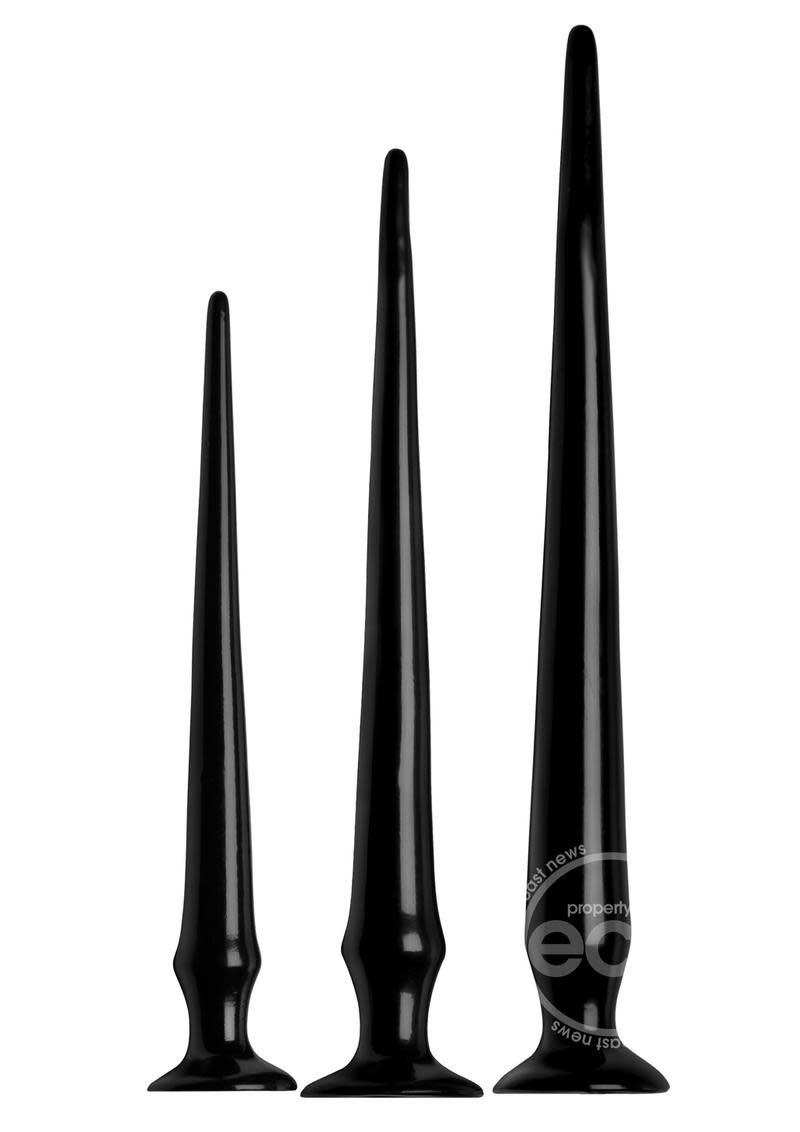 Reach your deepest parts with this trio of Tapered Anal Hoses! Each hose is long and flexible to probe your depths to a new level, stretching your backdoor with each inch inserted. The gentle taper, forgiving density, and graduated sizes makes these long anal beauties perfect for most anal enthusiasts! Enjoy each slithering inch to push your anal limits to new heights! Each graduated size features additional inches in length and a sizable difference in girth so you can explore your sexuality at your own pace. The sturdy suction cup bases holds these Hoses firm on any smooth and flat surface so you can enjoy their length without them falling over. Constructed with phthalate free PVC for a body safe backdoor fill and compatible with water based lubes only.