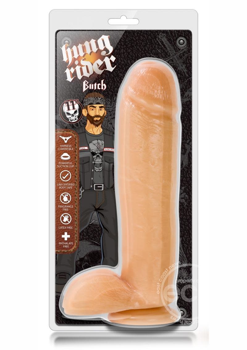 Take this bad boy for a wild ride! If you need to ride longer, thicker and harder, hop on a Hung Rider. This dildo is sculpted in all its girthy glory for the most intense experience of your life. Butch has 10.5 super thick inches (2.5 inch girth!) of manhood for you to master. He is realistically textured and made of fragrance, latex and phthalate-free PVC. Equipped with a O-ring harness-compatible suction cup.