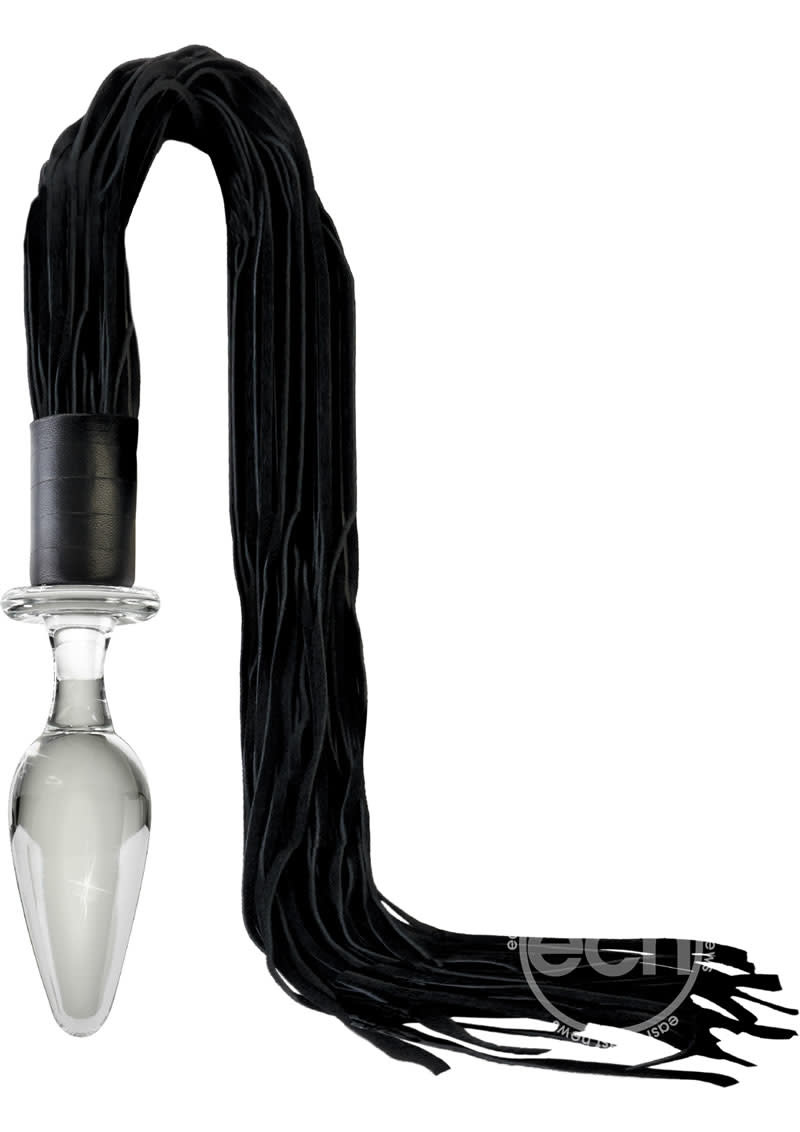 This luxurious glass flogger features genuine bull leather tresses that are soft enough for beginner play, but heavy enough to deliver a firm whack! The smooth glass handle offers a comfortable grip and doubles as a smooth anal plug that features a tapered tip to ease insertion, a bulb that provides extra sensation, and a narrow neck that allows your muscles to wrap around and hold it in. The ergonomic design of the base ensures it won't slip too far inside while still fitting comfortably between your cheeks.