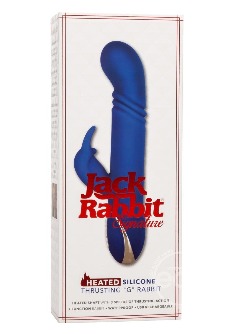 After over 30 years of pleasure, the Jack Rabbit® has crafted their most luxurious vibrator yet. The Heated Silicone Thrusting G Rabbit is a premium silicone vibe with 7 functions of vibration, 3 tip thrusting speeds and unique heating element. The ravishing rabbit flicker to the rhythm of 7 thrilling functions vibration to tease, please and tantalize.Indulge in deep, rumbling stimulation with a sensually curved G tip and 3 functions of shaft thrust levels. This one-of-a-kind rabbit knows how to turn the heat up in the bedroom with a unique heating element that can reach up to 131° F (55° F) in just 4 minutes. Use the independently controlled heating element to get things hot and heavy at the touch of a button.Whether you're taking a dip with a lover or indulging in a steamy solo session, look forward to up to 2.5 hours of waterproof vibration. Recharge pleasure and get back to playtime in only 2 hours with the provided USB cable. The flexible massager is made from a hygienically superior silicone. This body safe material is unscented and phthalate free to keep your most sensitive spots happy and healthy.