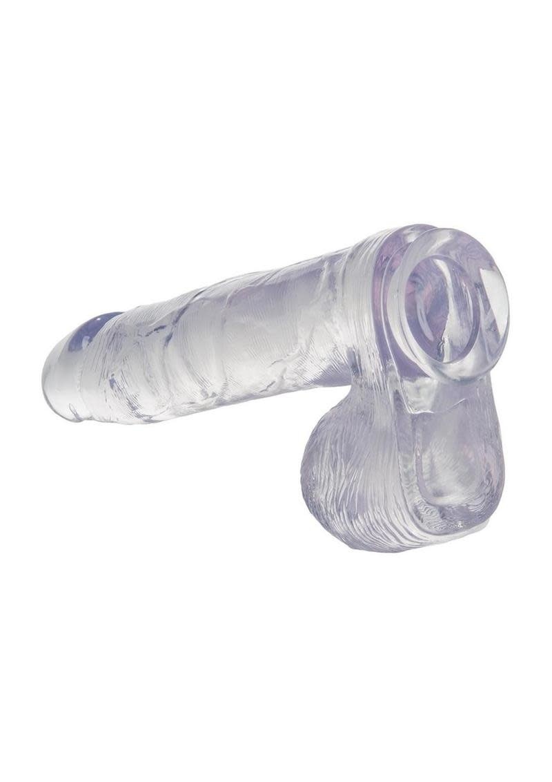Dong with Suction Cup 8" Clear. Jelly Royales superior jelly dong is highly detailed, high quality dongs in a variety of shapes and sizes. 8 inches translucent jelly dong with balls and suction cup base. Harness compatible. Soft and flexible PVC. Dong measures 8 inches long by 1.75 inches wide. Safe and pure for body and pleasure. Made using phthalate free, non-toxic materials: PVC.