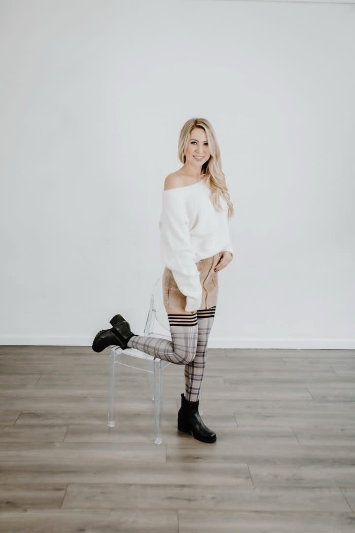 Classic and sophisticated tan and black plaid thigh highs. A day or night wardrobe essential. Kix'ies thigh highs are designed for all-day wear, with a no-slip-grip. Available in Petite to Plus Sizes, Kix'ies are the #1 thigh-highs that actually stay up!