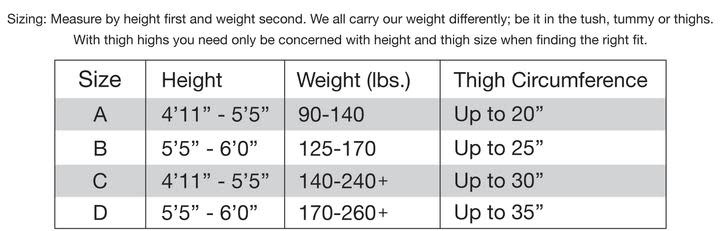 Sizing: Measure by height first and thigh circumference second. Weight can be arbitrary when sizing for a thigh-high.