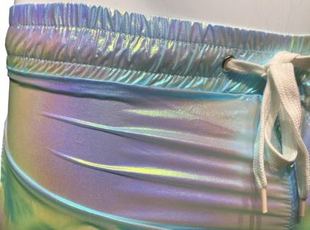 Cool iridescent fabric that changes colors with movement. Super light weight Non-stretch so runs small with 2 side pockets. Fit hugs your body and makes your butt look amazing! color is more of a sky blue with mint undertones.