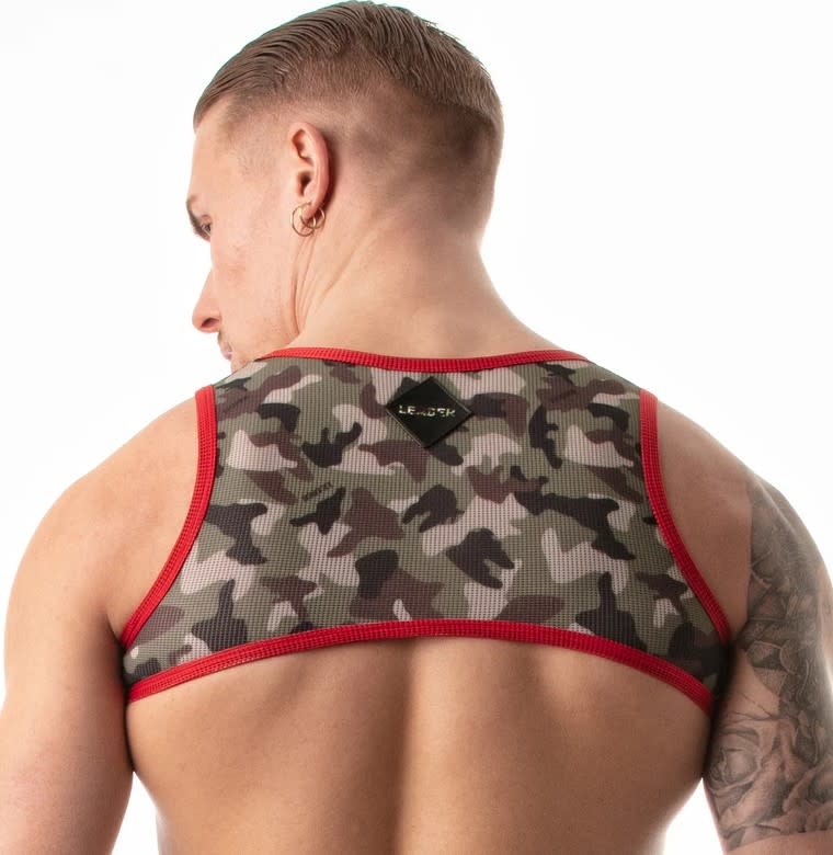Camouflage print party harness made from a stretchy quick-drying sports fabric for ultimate comfort and function. Highlighted with a bold colour trim. LEADER torch logo printed on the left pec. Completed with a pleather LEADER label on the back.