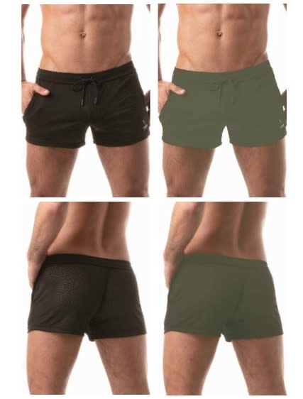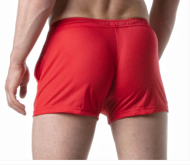 Made from a stretchy sports mesh fabric. These classic butt hugging shorts emphasise the legs and butt. The garment has an adjustable elastic drawstring waist. Featuring side pockets, and a LEADER brand label on the left leg above the hem.