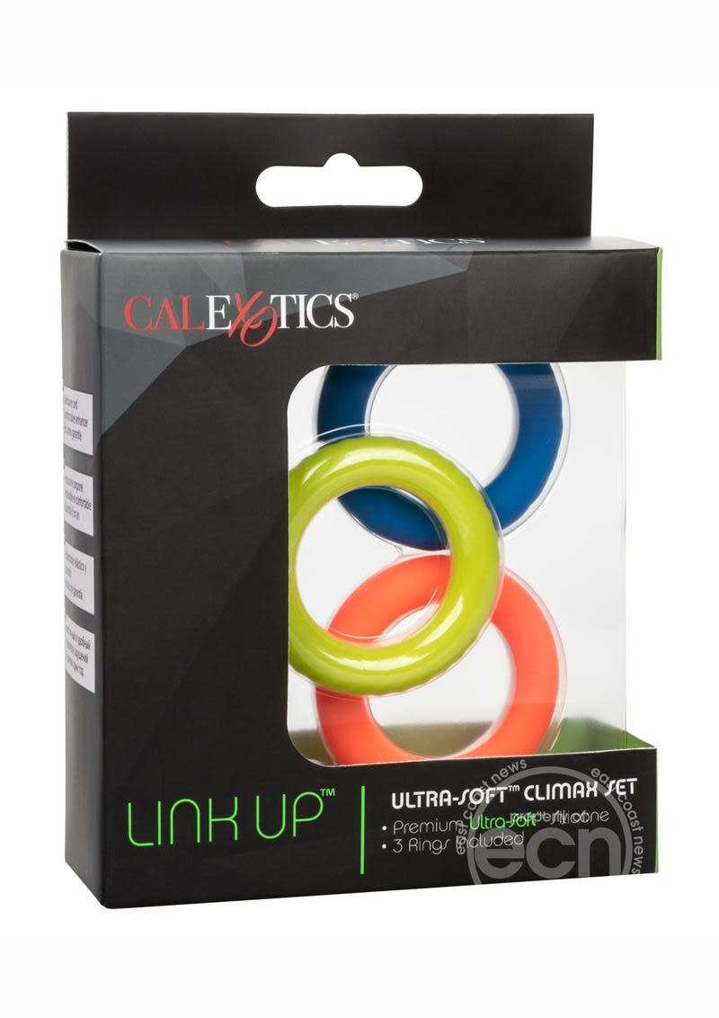 Link Up Ultra Soft Climax Set 3 Cock Rings from California Exotic Novelties. From bashful beginners to erotic experts, the Link Up Ultra Soft Climax Set will wrap you up tight in pleasure with a set of 3 ultra plush, ultra stretchy enhancer rings. Each cock ring in this set has a unique texture, one smooth, one ridged and another rippled, for a sensational experience with every wear. These uniquely textured cock rings are made to increase stamina, improve sensitivity and deliver thrilling erection support. Look for to an explosive pleasure experience while the plush ring squeezes with every movement. Get playful by using multiple rings together or one ring to rule in the bedroom. The premium Ultra Soft silicone is body safe, unscented and phthalate free to keep you most sensitive spots, happy and healthy. Color Multi-colored. Materials Silicone. Features Phthalate Free, Waterproof. 1 year warranty. Measurements 1.5 inches ring. Bulk weight 2 ounces. Package 4 ounces. Package 7 inches by 5.25 inches by 2 inches.