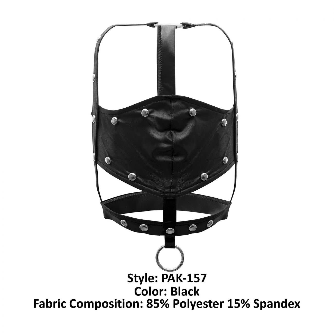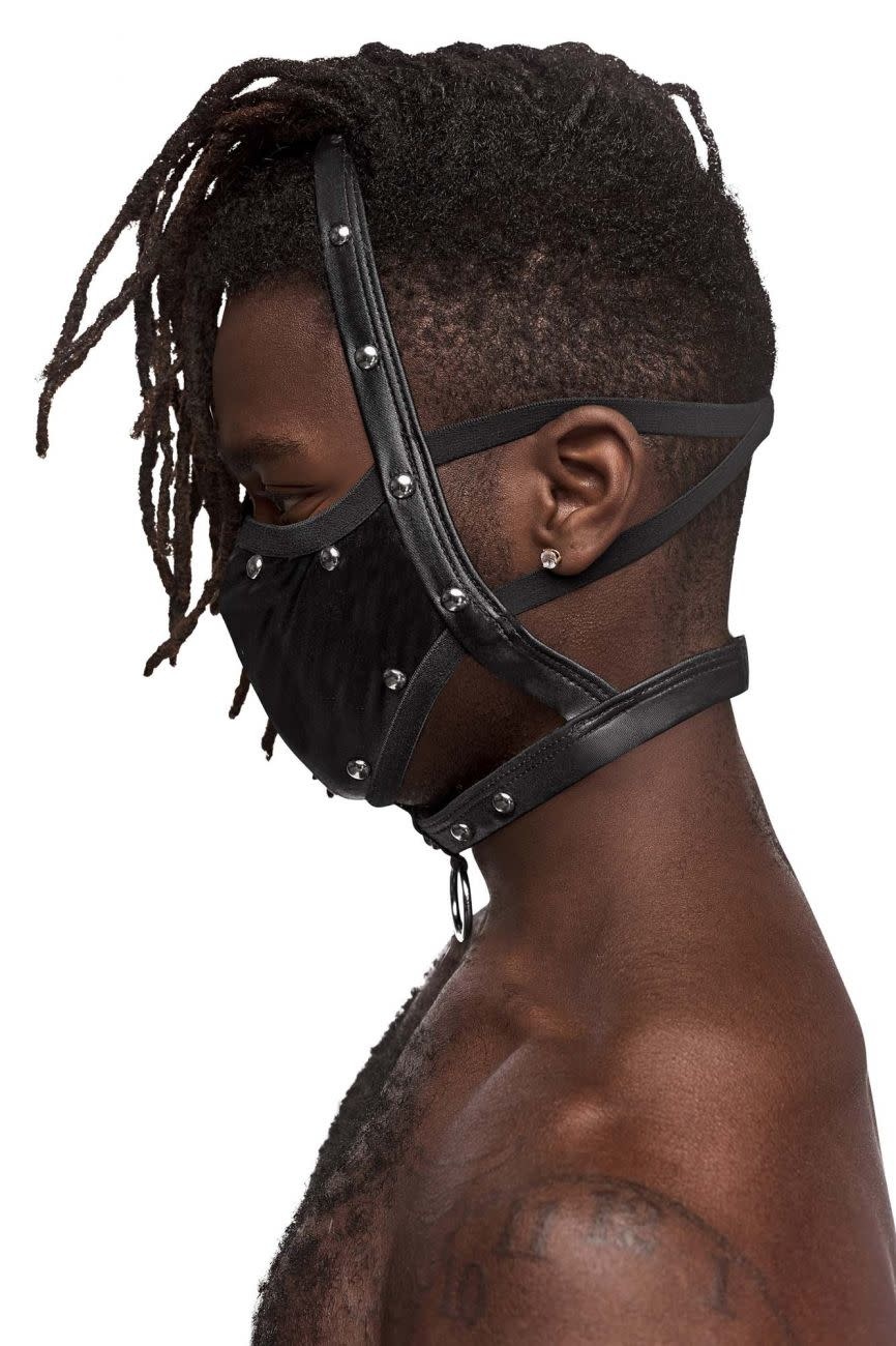 From the Fetish collection by Male Power, this style includes: A mask featuring an adjustable Velcro neck with a front ring, and plush elastic straps. Stretchy jet black four-way stretch leather look fabric adorned with decorative studs