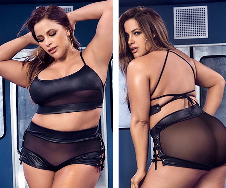 Sensuality and comfort at its best. Set in sheer and wet-look fabric with mesh underboob detail and crisscross eyelets on the side.
