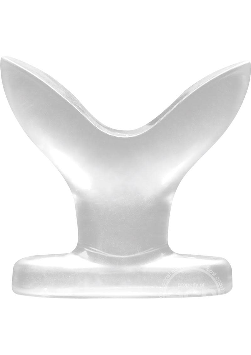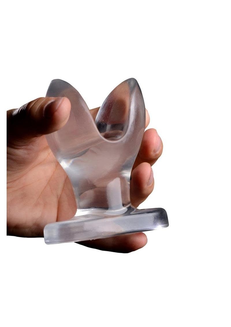 Open up so your partner can take a peek inside your hole! This expanding plug has a unique, flexible, flared shape for an intense feel and delicious pressure. Designed for the ultimate anal stimulation, this anchor-shaped plug has flared ends that pinch together into a tapered plug for an easy insertion. Once inside, the two halves will spread wide, filling you and pressing against the walls of your ass. This will ensure a tight fit that will keep the plug in place during even the most rigorous play! The soft material is flexible but rigid enough for intense sensations. Because this plug is clear, your partner will be able to see straight up into your stretched hole! Use with silicone or water-based lube and clean with mild soap and warm water.
