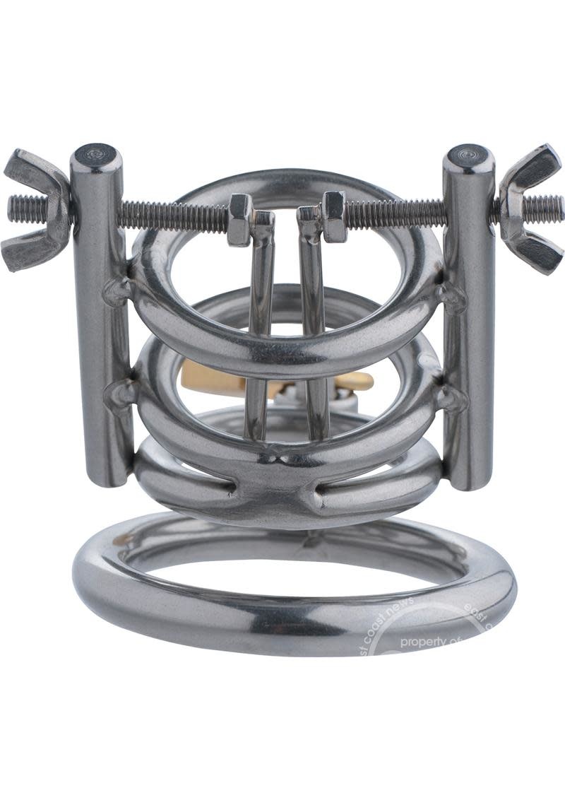 Confine your slaves penis in a CBT device that will ensure he experiences no pleasure! This chastity cage does more than just trap his cock and balls in cold, unrelenting stainless steel. It also features two spreaders, rounded and controlled by thumbscrews, to elevate your sadistic fantasies! Push his entire package through the base ring and then his shaft through the other three rings, and then lock into place. How long will you force your naughty boy to withstand the torment of the Deluxe Cleaver? Cleans and sterilizes easily with mild soap and warm water.