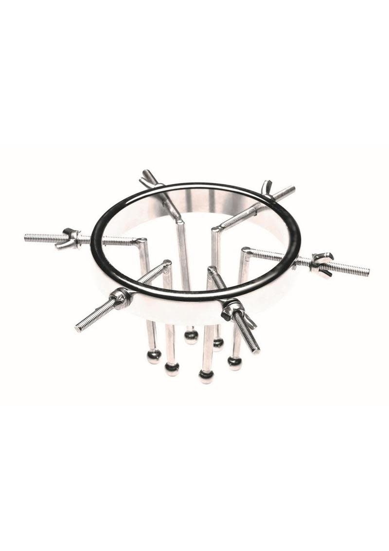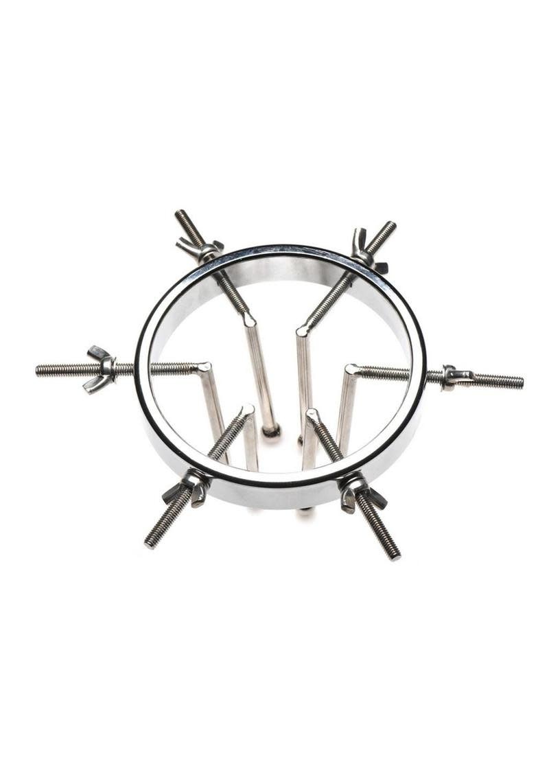 This stainless steel anal explorer is perfect for those into medical play who want to expand and stretch open their backdoor! Made out of strong, durable, non-porous, nickel-free steel, it's compatible with all lubricant types and is nonporous. The Anal Explorer consists of one large ring with a diameter of 4.1 inches and 6 dilators that have smooth rods with small, round, balls on the ends of them. Insert it almost 3 inches deep and spread their hole wide open! The ring is wide enough for you to fit your fist through, as well! Each dilator rod can be adjusted individually using the wingnuts to tighten or loosen the position on the screw. Only the smooth steel will be pressing against the sensitive tissue of the anus while the spiraling screws are outside against the buttocks. To clean after use, rinse with warm water and mild soap or boil it in water. Then spray it with isopropyl alcohol and wipe clean.