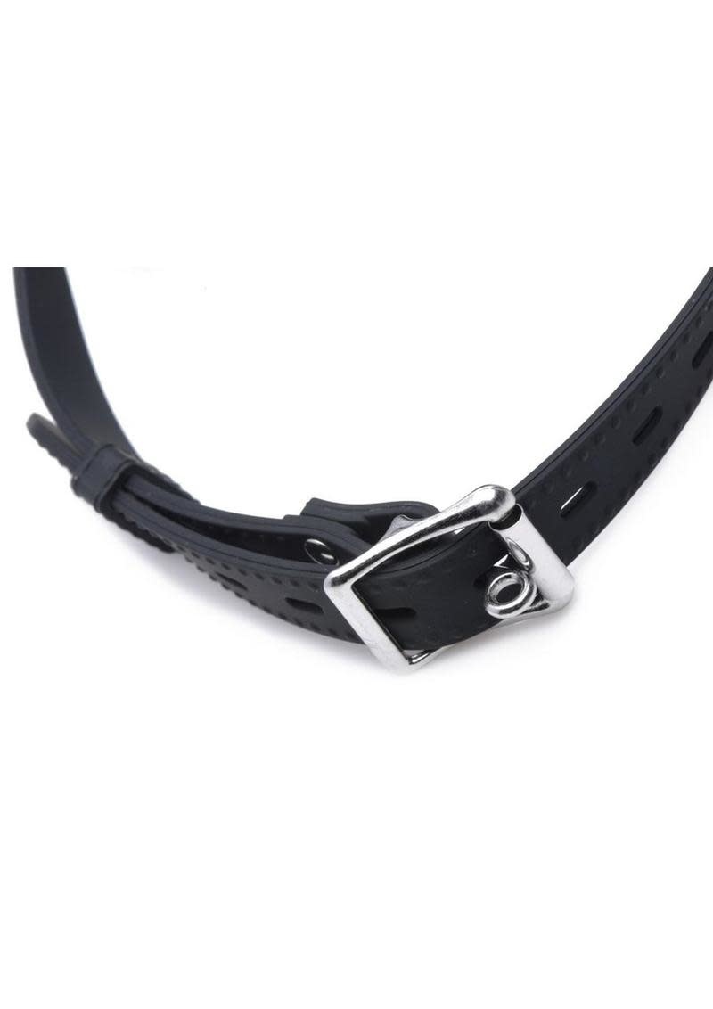 Plug up their pie hole with this unique silicone gag. Push the ring past their teeth and secure the soft straps at the nape of their neck. The buckle can accommodate a lock, not included, to ensure that there is no hope for escape. Keep your plaything plugged up so that all you can hear are muffled moans and garbled groans. Or remove the plug to savor every whimper and gasp. The plug is connected by a chain so that you never lose it. The opening is 1.5 inches to accommodate the possibility of forced penetration. The premium silicone material is non-porous and phthalate-free, and cleans easily and thoroughly with mild soap or toy cleaner. All hardware is nickel-free.