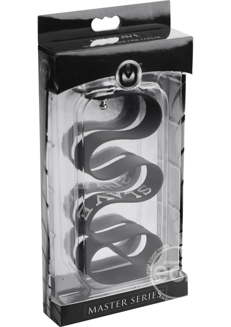 Master Series Silicone Collar Slave Black O/S. Claim your submissive with this high quality silicone collar from the Master Series. This comfortably slender silicone collar is adjustable, to ensure a snug fit. The collar makes the ultimate statement, with the word SLAVE simply stated on the front in raised white silicone letters. Adjustable notch closure in the back. Ideal for a night out, or a naughty BDSM session. Measurements 17.5 inches in total length, 0.75 inch wide. Materials Silicone, metal. Color Black.
