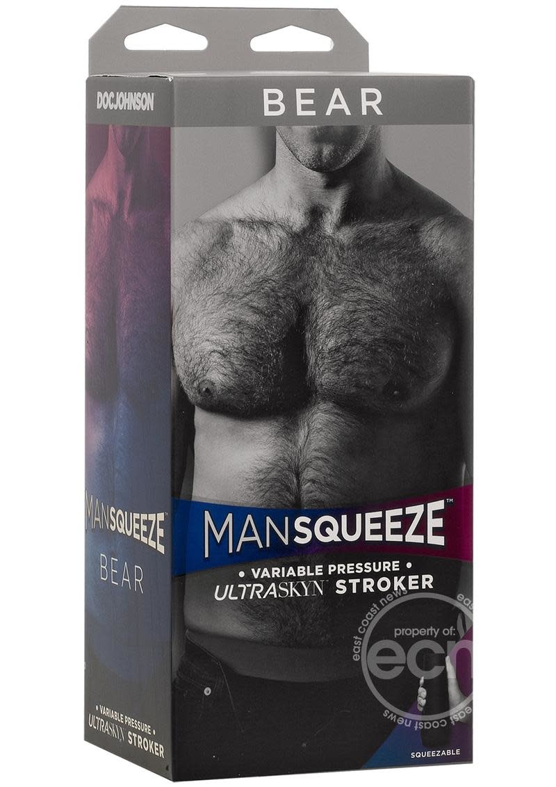Get your man. Doc Johnson’s Main Squeeze line of hard case masturbators now offers Man Squeeze, a collection created especially for men who love men. Crafted with a suction-adjusting end cap and squeezable grip that lets you vary the tightness of each stroke, Bear features a larger exterior ass shape in lifelike ULTRASKYN™, with a tight hole at the entry that relaxes deeper inside. Just like its Main Squeeze™ counterparts, this stroker is crafted with a unique internal texture to make you feel like you’ve tamed the manly beast you lust for. The double-cap hardshell design doubles as a discreet travel and storage case, keeping your Man Squeeze fresh and ready for whenever the mood strikes.