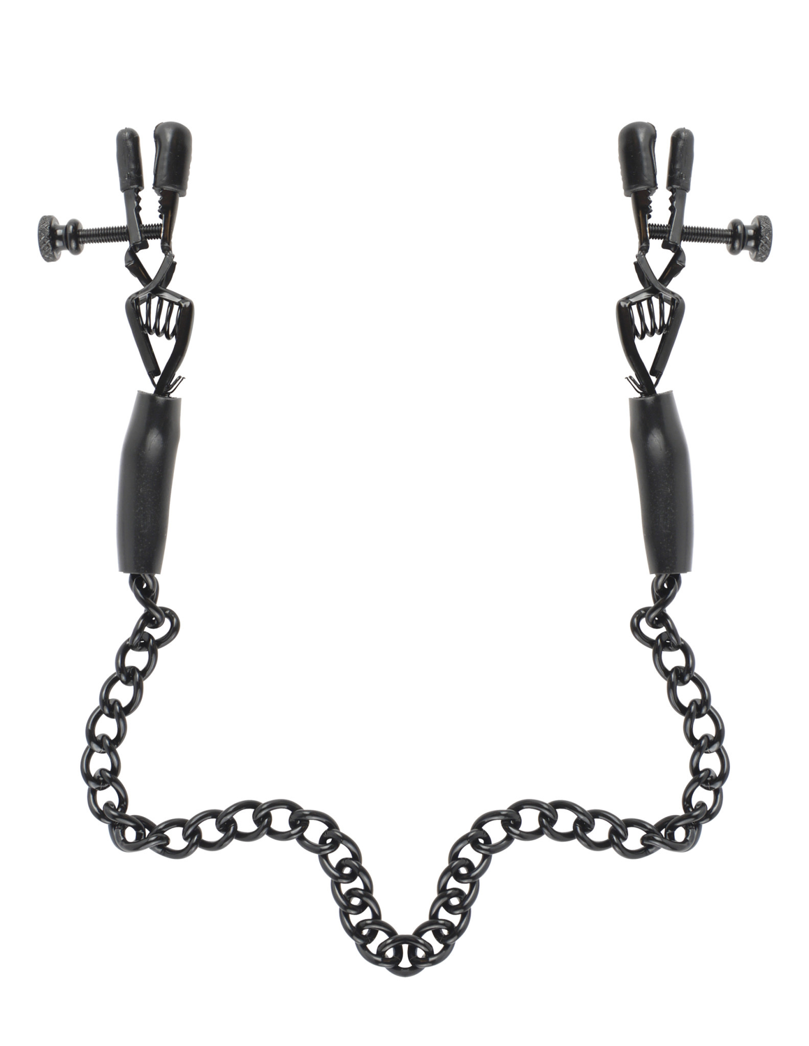 Make your nipples perk with pleasure with these Adjustable Nipple Chain Clamps. Just squeeze the spring-loaded clamps over your nipples and adjust the screw until you reach your desired tightness. The clamps are lined with rubber to help ease the squeeze, while the sturdy metal chain allows for other pleasure possibilities.