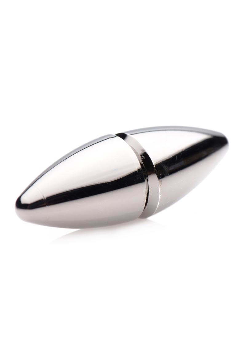 Catch their naughty bits in your crosshairs! Experience piercing pleasure from these magnetic clamps. The gun metal finish and distinct shape create an attractive appearance that looks like a real piercing, but feels like a pinch! Two magnet sets are included to use on both nipples, on the labia, and more. Wear them during foreplay or even during sex. The pressure will heighten the atmosphere of your sexiest sessions. Made of nickel-free aluminum for a sleek, seductive aesthetic.
