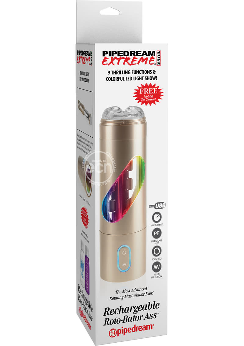 Pipedream Extreme Toyz Rechargeable Roto Bator Ass. Get ready for the most incredible, most intense, most advanced rotating masturbator ever imagined! The Rechargeable Roto Bator is the ultimate turbo powered masturbator that does all of the work for you! No more pumping, stroking, or squeezing, just push a button and enjoy mind blowing stimulation developed to make you cum harder than ever before! Unlike ordinary strokers that barely move up and down, the Roto Bator's advanced rotation mechanism puts a whole new spin on male masturbation! With each revolution of the soft sleeve, the tight ass wraps around the sensitive areas of your cock while the tiny ticklers tease and please, delivering spine tingling sensations that are better than the real thing! You get mind blowing satisfaction when you want it, for as long as you want, without any strings attached! Powered by an ultra strong motor, this full automated masturbator features nine thrilling rotation patterns to choose from. Each pattern has a colorful LED light display that changes color with each movement. The reverse oration button instantly changes direction of the spinning pleasure sleeve, allowing you to experiment with endless pleasure combinations every time you use it. It is engineered like no other masturbator on the market, with independent controls for function and rotation direction. Press the bottom button to power up the Roto Bator and cycle through all nine functions. Press the top button to instantly reverse rotation direction of the sleeve. Hold the power button down for three seconds to turn the device off. To charge your Roto Bator, plug the included USB cord into any USB plug and let it charge for 2 hours. Run time is approximately 1.5 hours per session. The long cylinder and stretchy sleeve can accommodate a wide range of sizes and girths, just be sure to use plenty of Moist Body Lotion when you insert your penis inside the pleasure sleeve. Specifications: lube included, toy cleaner included, lights up, phthalate free, plugs In the wall outlet A/C power, multispeed, multi vibration, rotates, reverse rotates, single entry. Requires charge through USB. Materials ABS Plastic, Thermoplastic Rubber TPR, Metal.