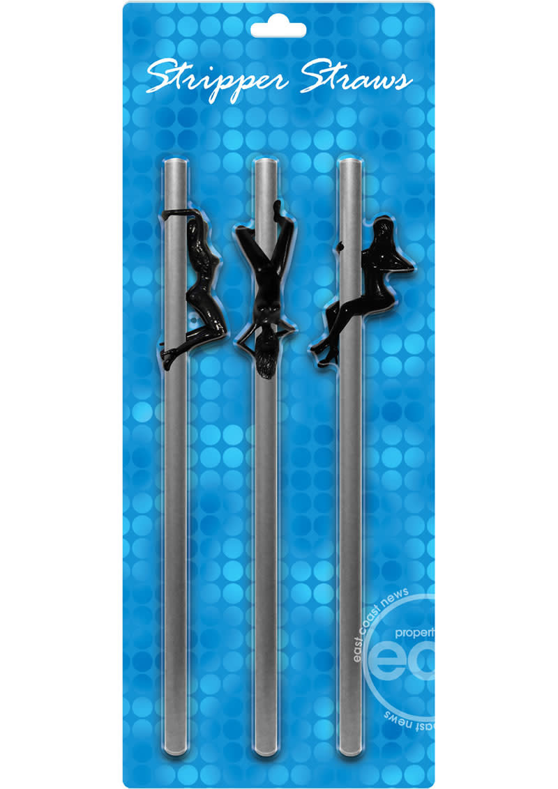 Stripper Straws Female from Kheper Games party supplies. Each package contains 3 silver colored straws with plastic figurines of sexy strippers attached to each one! Strippers can be moved up and down their poles to accommodate various cup sizes. Straws are 8.5 inches tall.