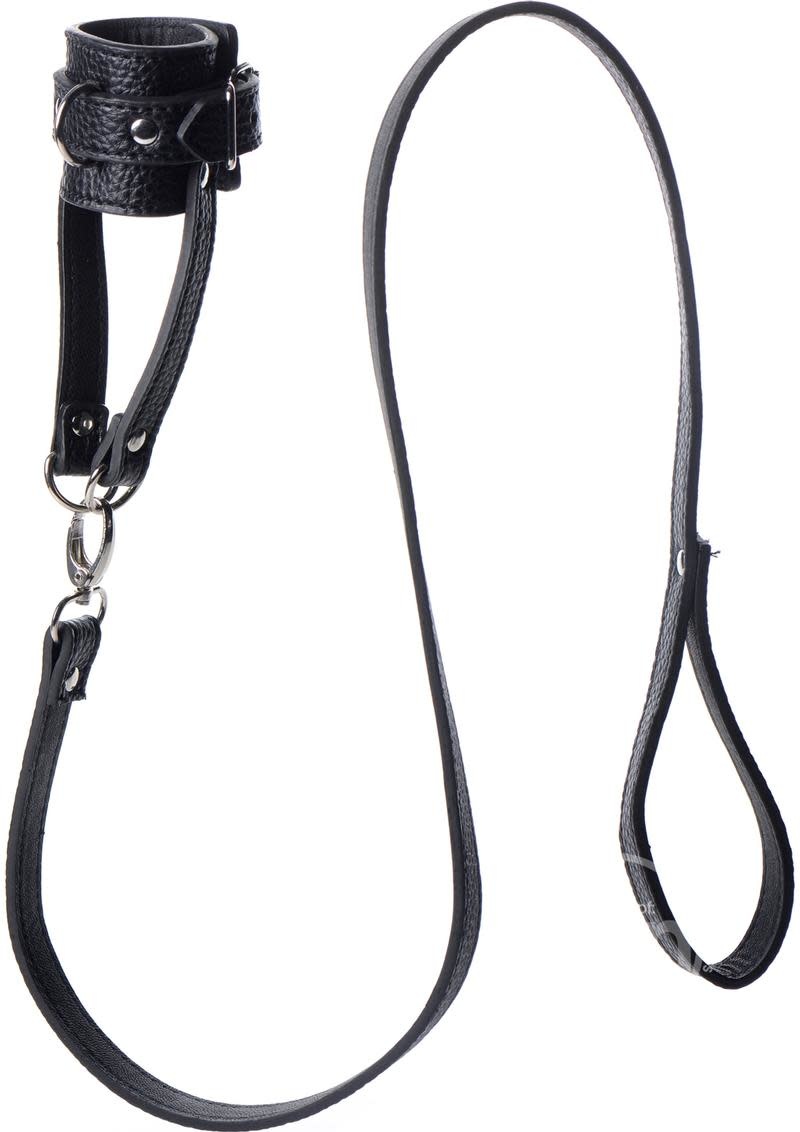 Take your pet for a walk with this humiliating ball-stretcher and leash set! The adjustable stretcher will wrap around his scrotum and tug down, creating a unique sensation that will keep him on edge! Attach the leash to the D-ring on the front or on the straps at the bottom, to pull your plaything around by his balls! You can also use the D-rings to connect weights so that your slave is further tormented.