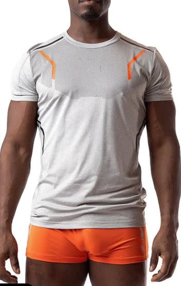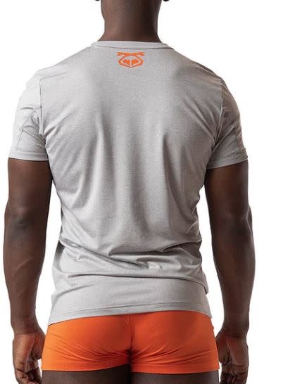 This is our third season doing our NP/GYM line, and it is by far the best. This shirt is super sexy and truly work at the gym and for everyday use. Made of a custom light weight performance fabric that is anti microbial and wicks sweat away. We love this color grey and orange color story.