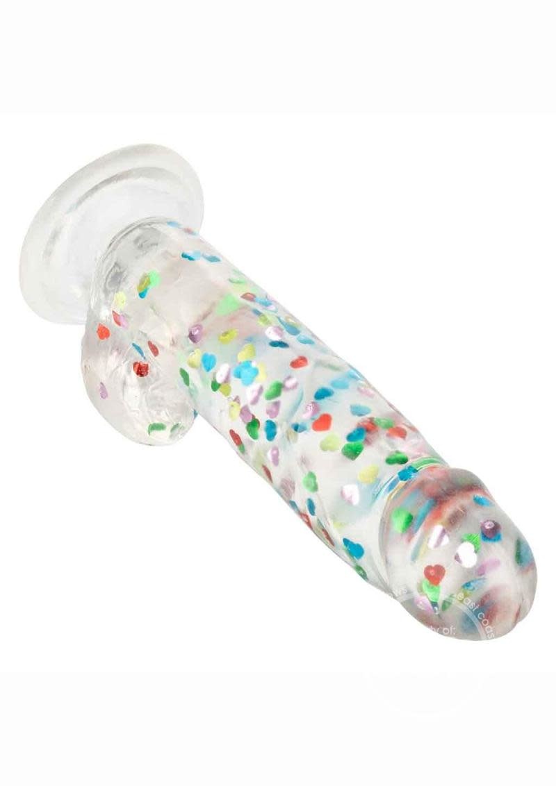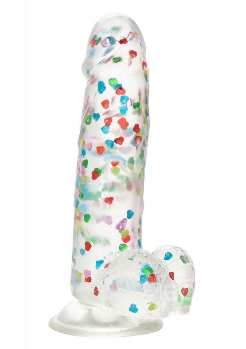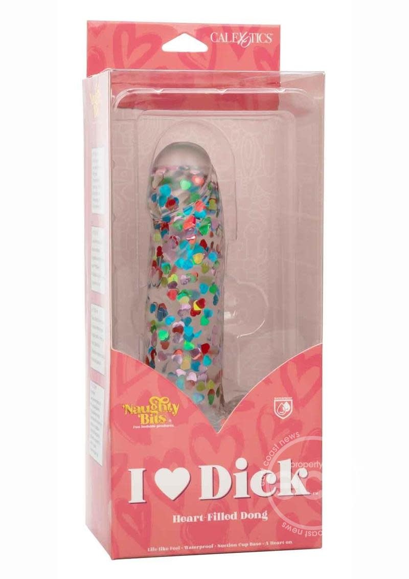 The Naughty Bits I Love Dick Heart Filled Dong is one heart-on you will love! The playful dong is crafted with a like-feel feel, suction cup base, and sparkling heart confetti design. Deliver the pleasure you’ve been craving with a 6-inch long dong with helmet-top, textured shaft, and life-like balls. The extremely flexible design makes this an extra comfortable ride. The flanged base has a sturdy suction cup that can be used in a harness or mounted to a flat surface for sensation hands-free fun. The Naughty Bits™ collection is made to stand out in any nightstand with eye-catching designs and orgasmic features. The ultra plush material and playful of this naughty dong will make even the most stylish lover smiling before and after.