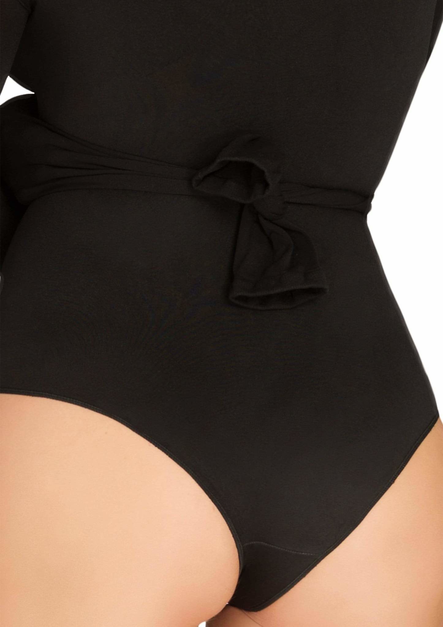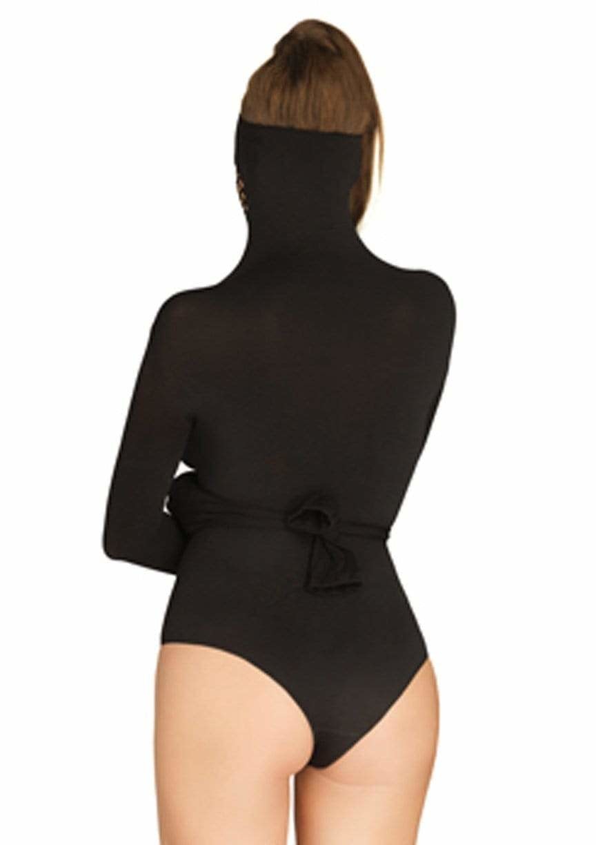 Opaque and net masked teddy with wrap around restraint sleeves.