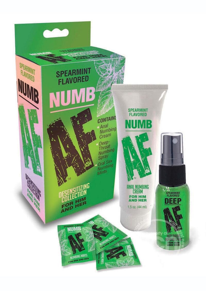 Numb AF desensitizing collection contains a 1.5oz tube of spearmint flavored anal numbing cream, a 1oz spray bottle of our special formula of Deep AF a deep throat numbing spray, and three packages of Numb AF oral mints that can be used to help alleivate the gag reflex often associated with oral sex. The Numb AF desensitizing collection was created with the intention of creating a more pleasurable and comfortable sexual experience for lovers.