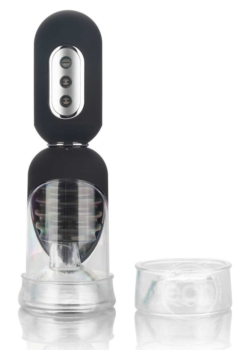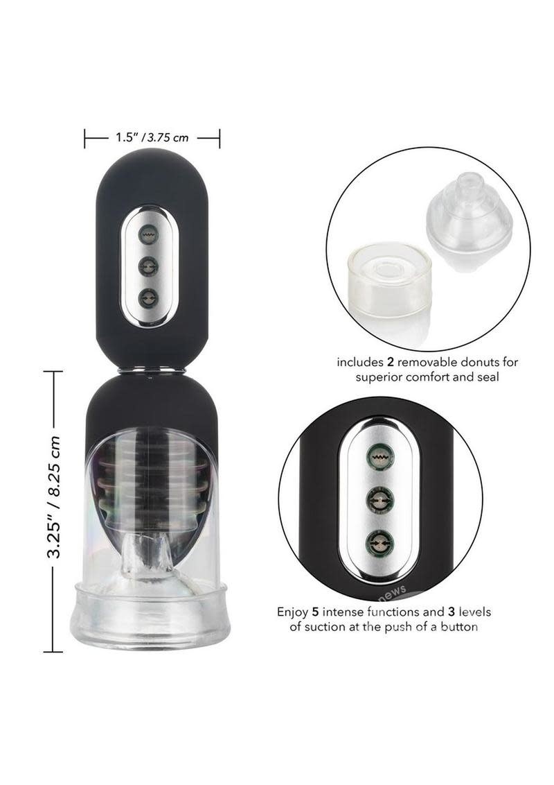 Dive deep into intense suction while the soft, vibrating internal landing pad uses the teasing ticklers to thrill your pleasure tool with full coverage stimulation. Enjoy powerful suction and a superior seal with two unique interchangeable donuts. Use the simple donut for your regular pumping session and the other ultra-tight donut for knee-shaking stimulation. This removable open-ended chamber sleeve is easy-to-use, easy-to-clean and requires no special care.