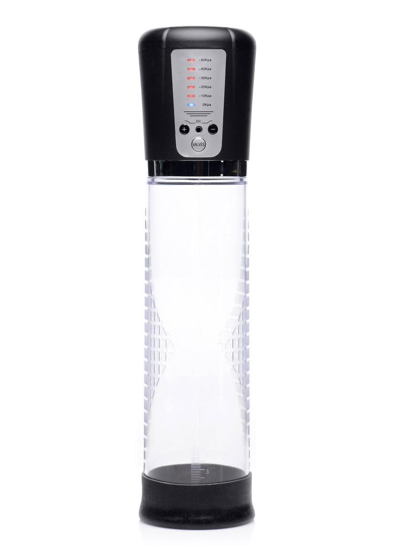 Explore 5 levels of suction, finding your perfect amount of pressure with the plus and minus buttons. The easy-to-read display will tell you how many pascals of internal pressure you are vacuuming your penis with. When you have had enough, a pressure release valve button will release the pressure so that you can play with your erection!