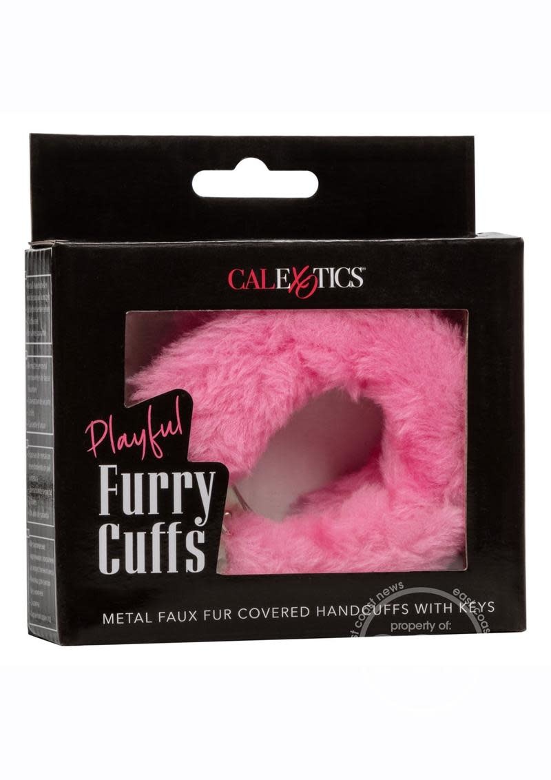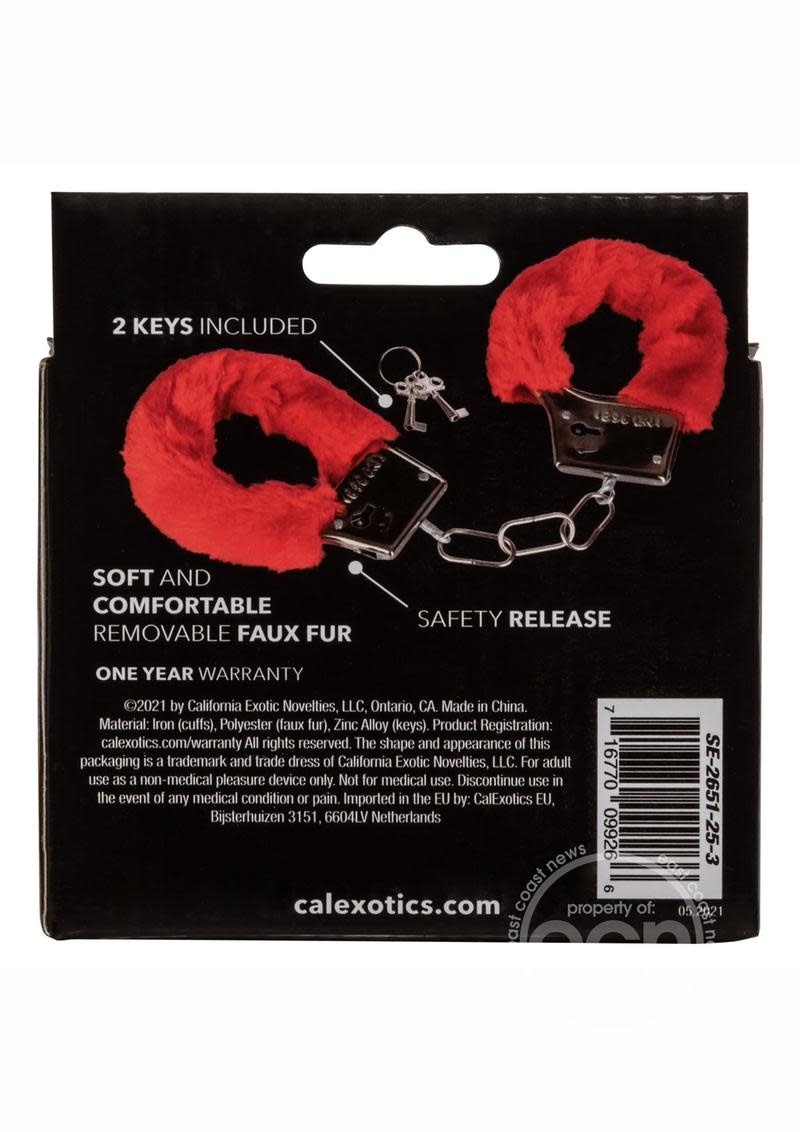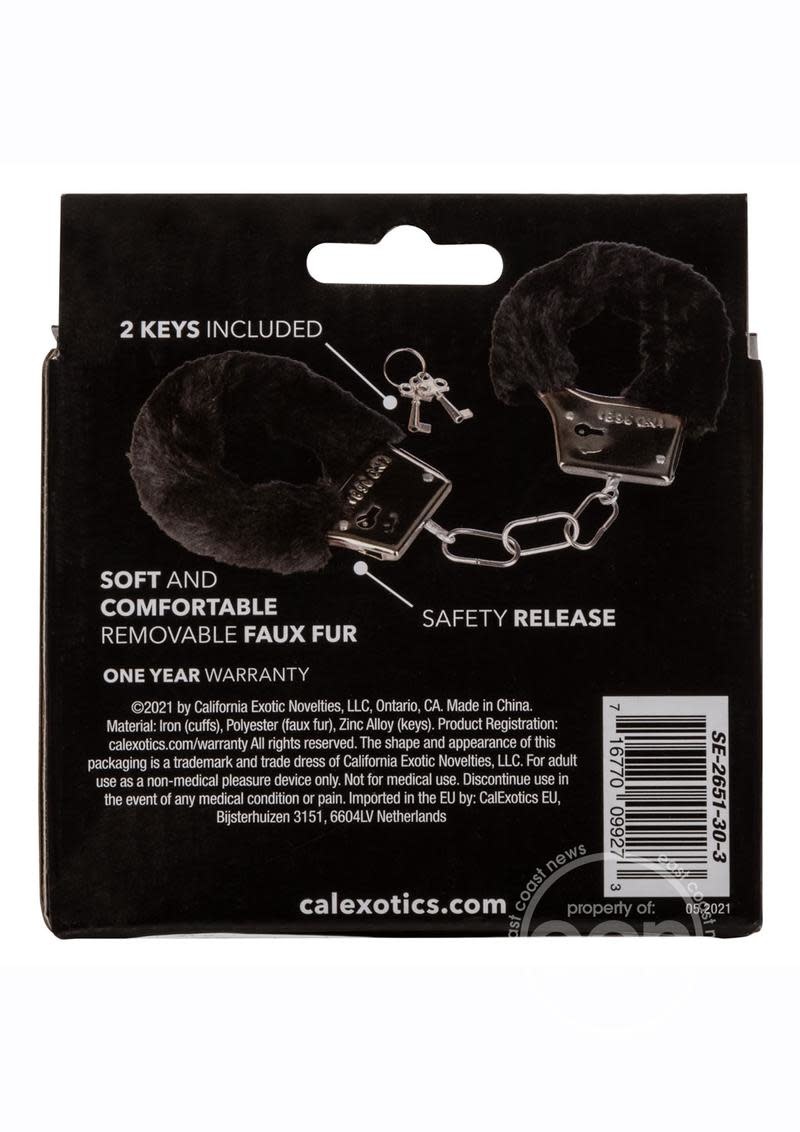 Metal faux fur covered handcuffs with safety release. Soft and comfortable removable faux fur. 2 keys included.