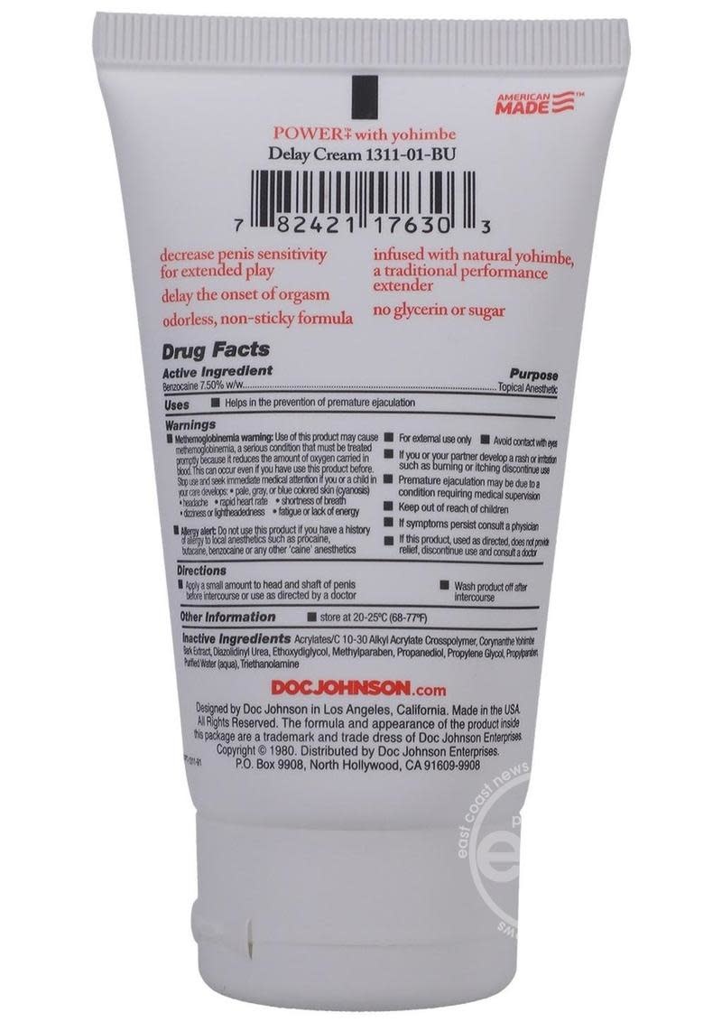 Get more banging for your buck with our Power+ cream! This prolonging cream contains 7.5% Benzocaine which acts as a desensitizing agent to help the man delay or prevent premature ejaculation. Odorless and tasteless. 2 oz.