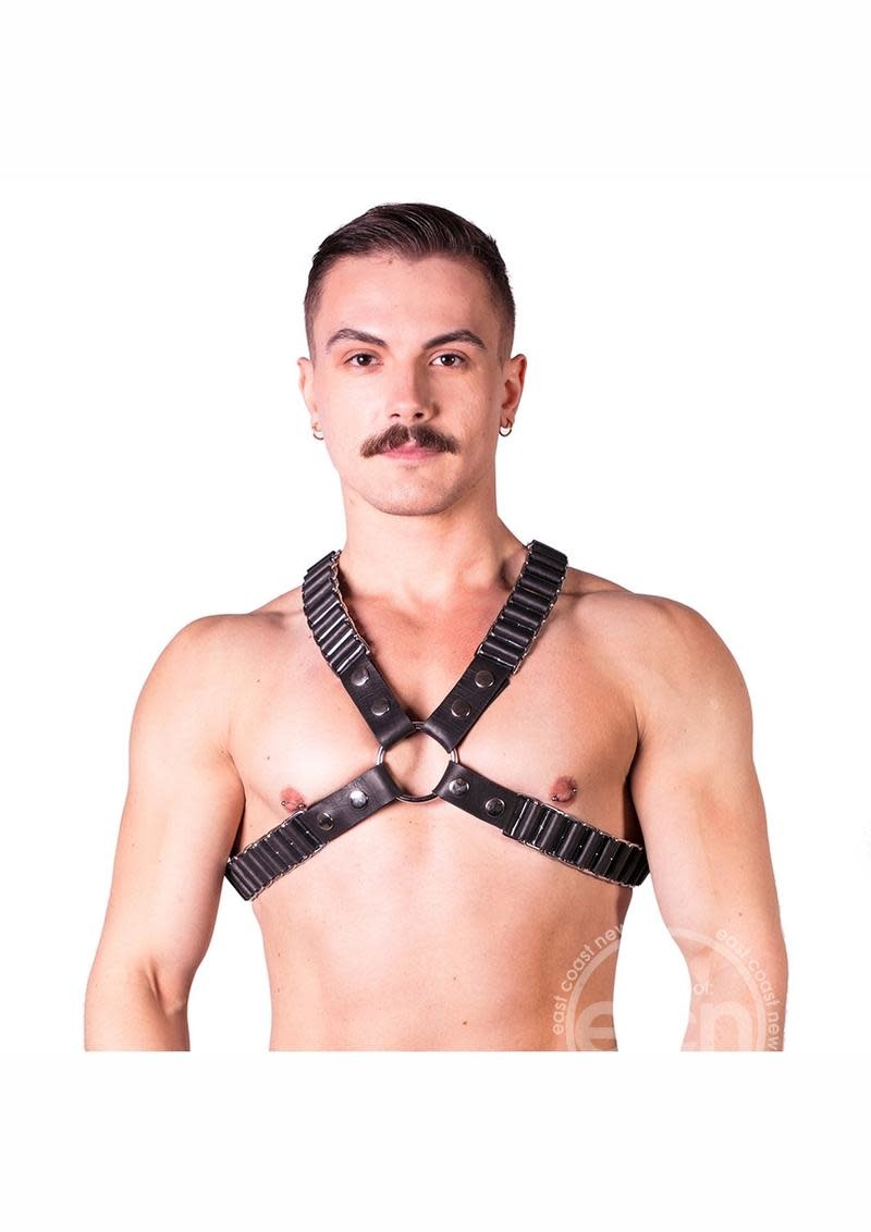 The Prowler RED Ballistic Harness is a striking piece which screams fetish role play and dungeon games. The X design with central ring and metal-work details create an eye-catching and practical harness. Featuring adjustable metal buckle straps and made from quality leather. Perfect to wear at your favourite fetish night.