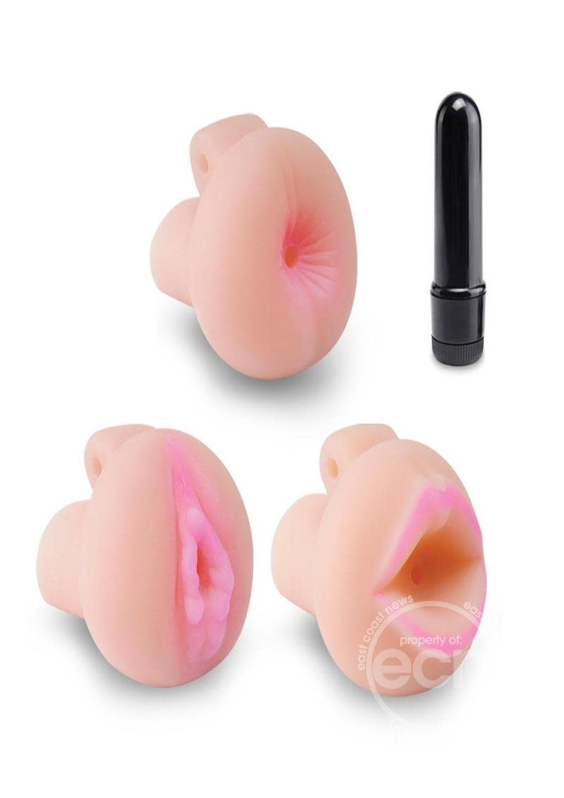 Enjoy every comfort of home when you're on the road with the amazing Travel Trio Pump Set. This portable collection of pump toppers will transform this ordinary penis pump into a combination masturbator and enlarging device. The deluxe 9-piece kit comes in a convenient travel box with handle and includes a Beginners Power Pump, 3 Fanta-Flesh pump topper pleasure sleeves, a waterproof vibrating bullet, a stretchy cockring, and free samples of our Moist lubricant, Pump Worx Toy Cleaner, and thickening cream.