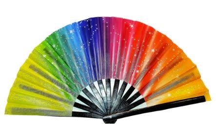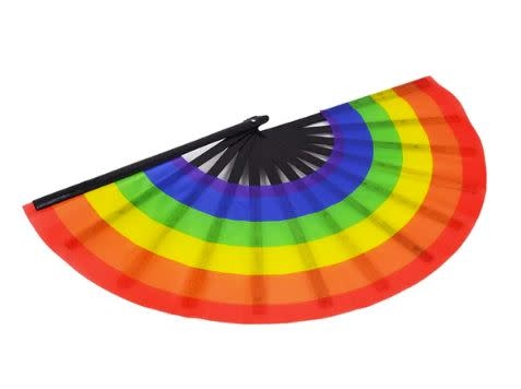 Printed Rainbow clack fan, great for pride, festivals, ETC. 13 inches long and measures 25 inches across when its open (normal size for gay clack fans) Spines are black painted bamboo.
