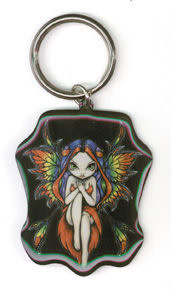 Wide-eyed fairy with rainbow colored butterfly wings, her hands clasped before her. 1.75"x2.5" die-cut enameled keychain. Artist: Jasmine Becket-Griffith