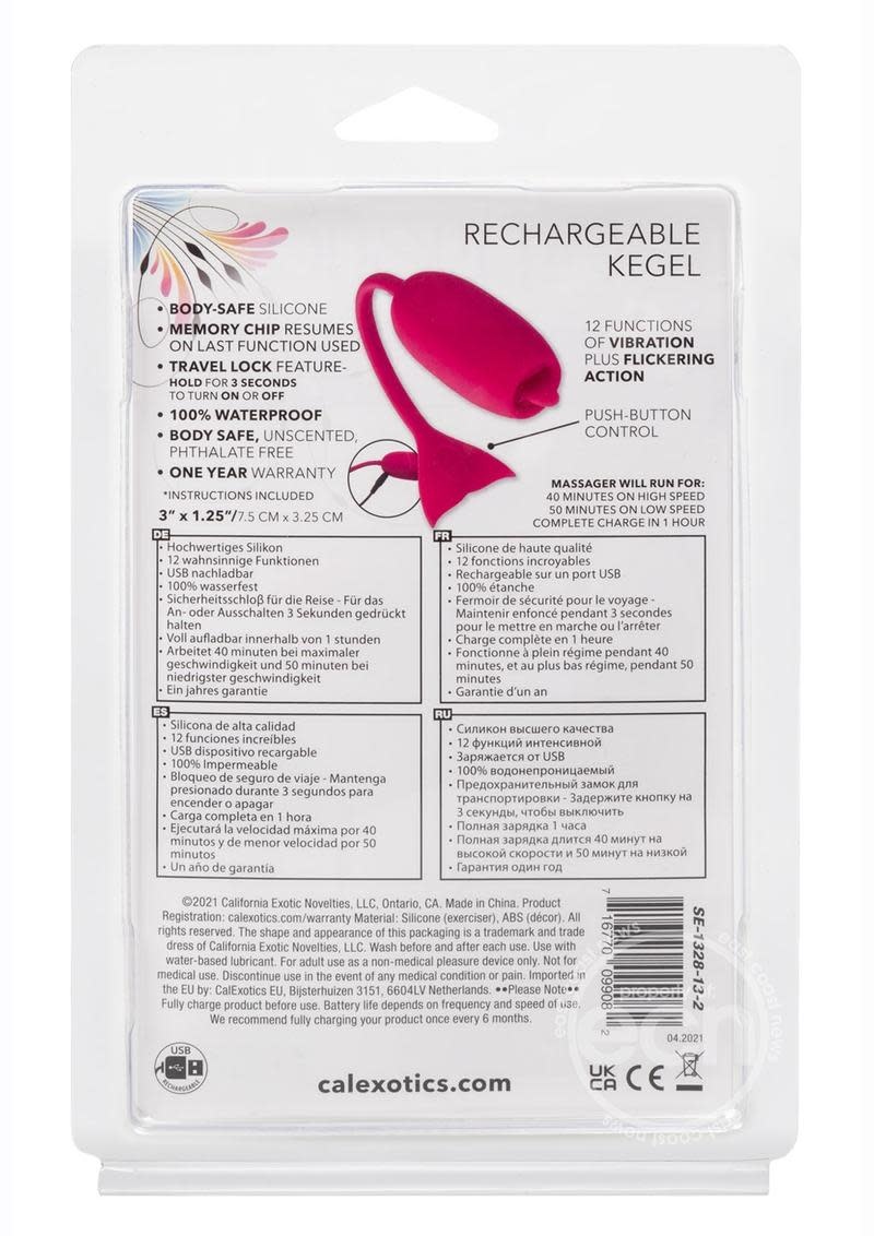 Pure Silicone Kegel exerciser with teasing tongue and easy retrieval cord. 12 intense functions of vibration, pulsation and escalation plus flickering action. State-of-the-art memory chip resumes on last function used. Easy push-button control with security travel lock feature. USB rechargeable – charging cord included. Complete charge in 1 hour. Runs for 40 minutes on high speed and 50 minutes on low speed.
