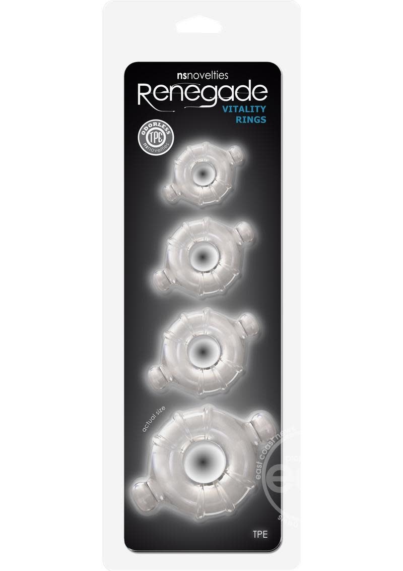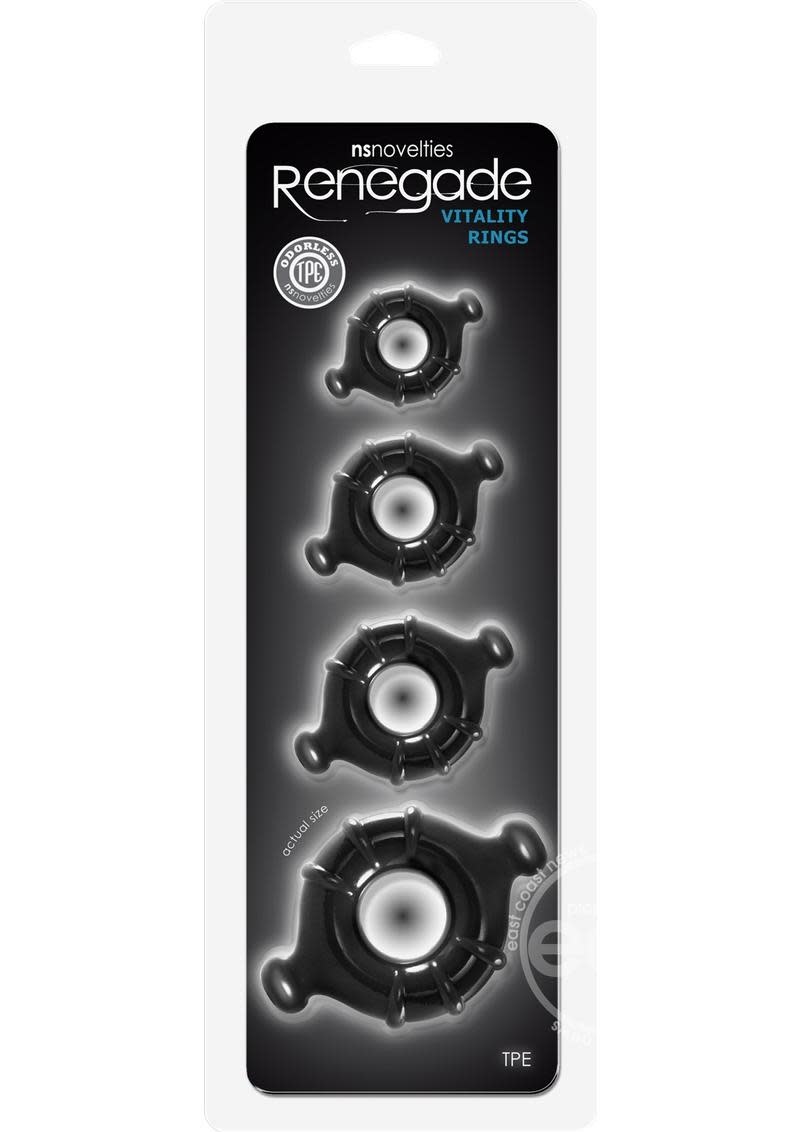 Constrict, restrain and revel in Renegades Vitality Rings. Extend your playtime by enticing your cock and balls with 4 varying sized cock rings in an unlimited number of ways. Made with odorless, pliable TPE. Vitality Rings are sure to multiply your experience. Suitable to use with all lubricants.