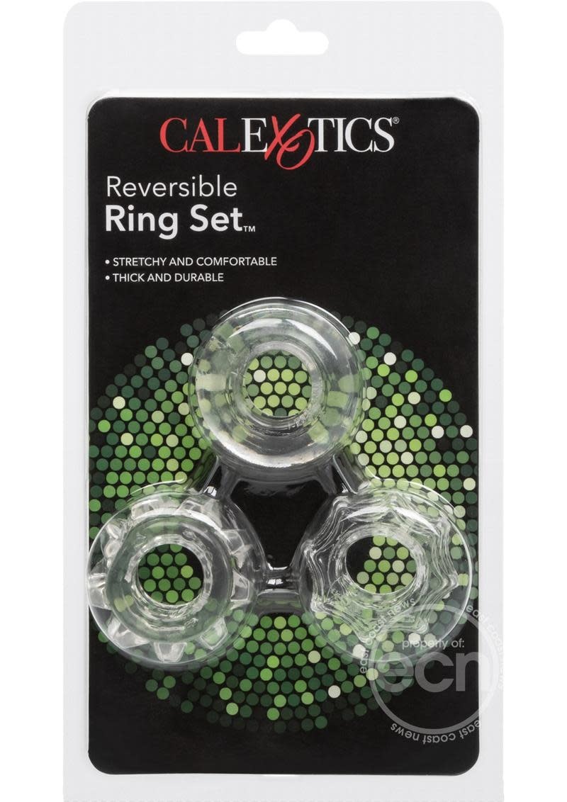 Spice up the night with the versatile Reversible Ring Set. The 3-piece set of erection enhancers is ideal for maximizing your erotic pleasure, and can be comfortably worn during foreplay fun or while enjoying solo play. The easy to use stretchy rings are thick and durable, and perfect for first time and experienced users.