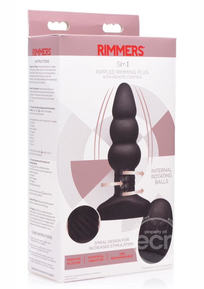 Our bulbed Model I Rimmer is now available in a slimmer size for those that prefer less girth! Savor each swell as they slide smoothly and sensually into your anus, delivering gradually increasing pleasure. Better than your average butt plug, this revolutionary sex toy will actually massage the opening to your hole with rotating beads and a spiral texture along its stem, providing a sensation similar to a rim job! Play with 3 speeds and 2 functions of swirling satisfaction around your sphincter. You will also be treated to 3 speeds and 5 patterns of vibration as the plug thrums inside you. An optional remote control can make playing on your own easier, but it can also provide wireless fun with a partner. Light up buttons on the remote and the plug make them easy to see in the dark. Made of premium silicone, this exciting tool is non-porous, phthalate-free, and waterproof for a body-safe experience and thorough sanitization with soap and water. A storage case is included.
