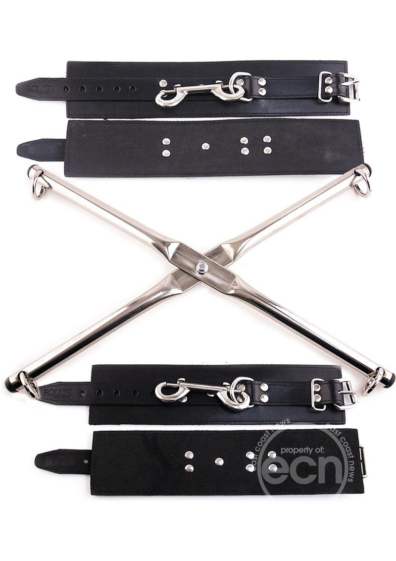 Ankle and wrist cuffs attach to this restrictive "X" shaped red hog-tie restraint via detachable clutch rings. Made of strongly welded metal, this restraint is supplied with both the ankle and wrist cuffs.