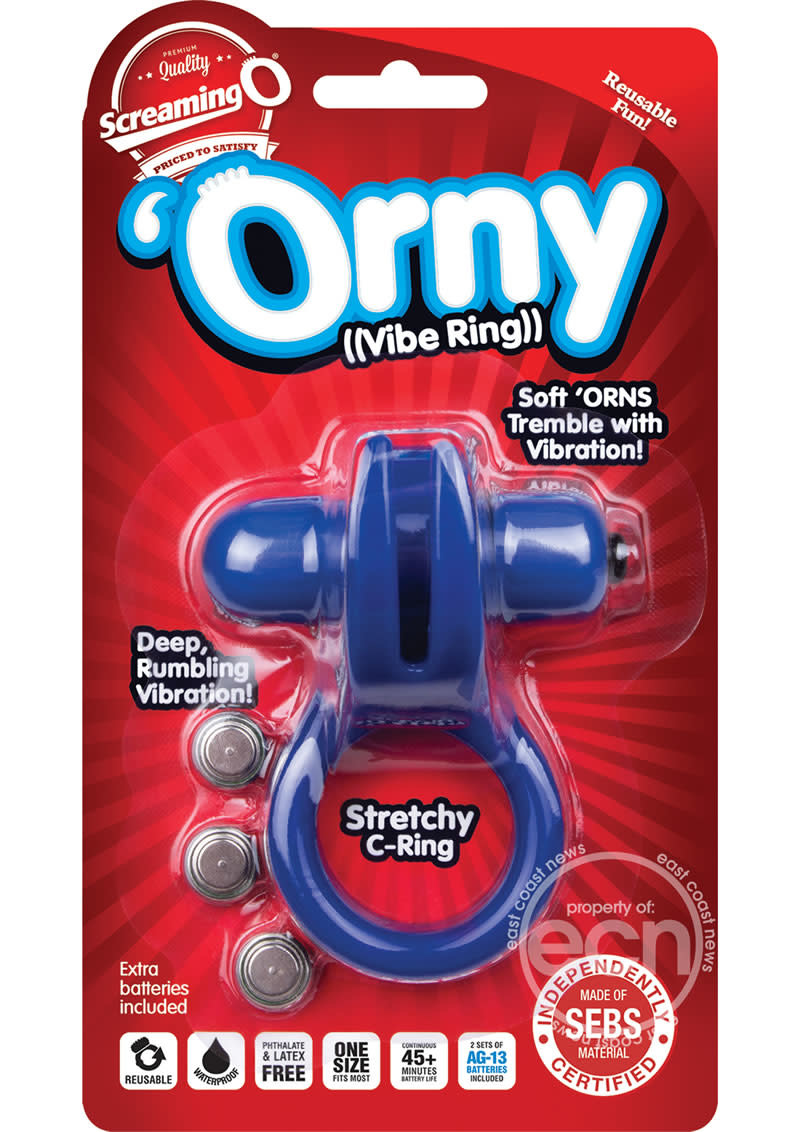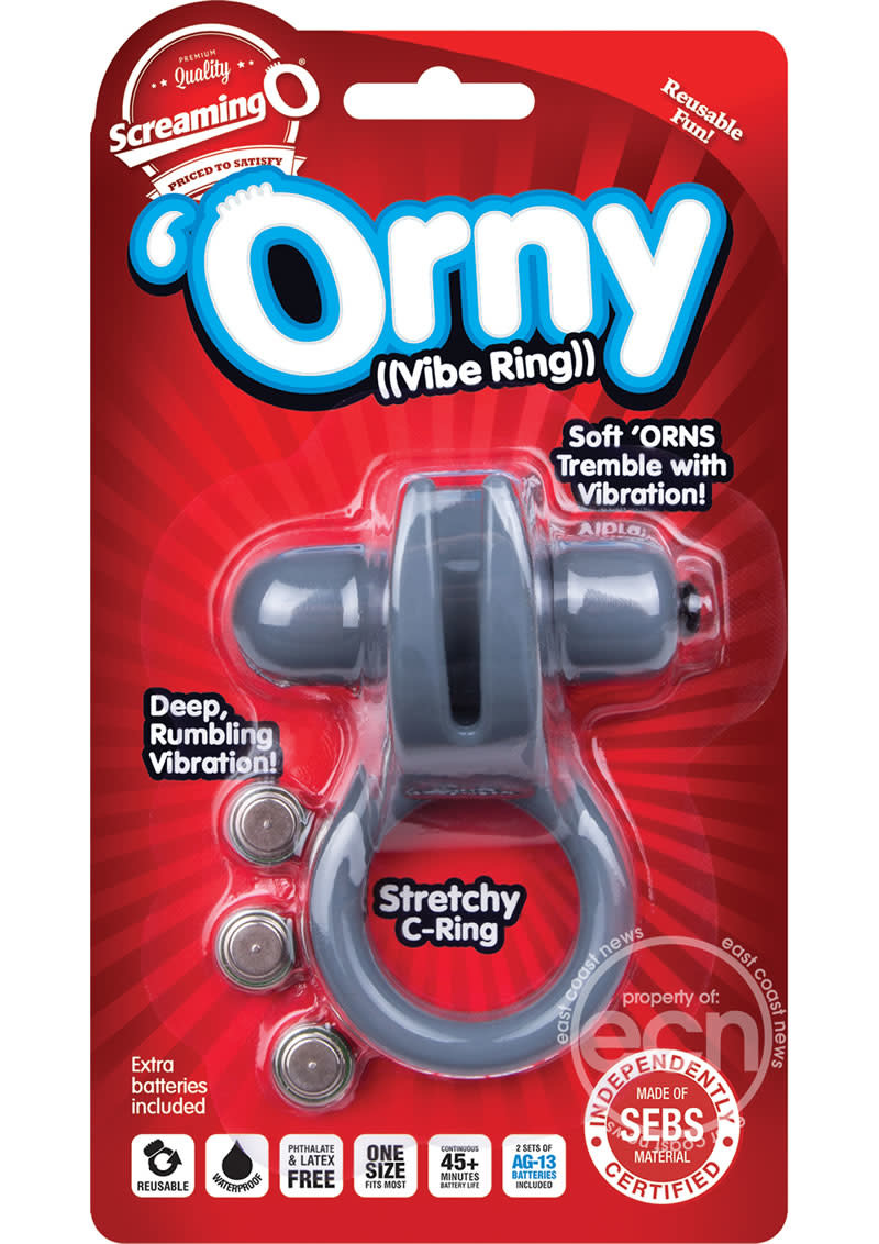 The Orny vibe ring gets couples hot and heavy fast with a unique shape specially designed for a dramatically different orgasm. The Orny is powered by a new low-pitch mini vibe that vibrates with a deep, rumbling sensation unlike anything you have ever felt. This one-size-fits-most cock ring is equipped with two soft, flexible horns that cradle the clitoris. Simply stretch the ring around the penis or both the penis and testicles with the vibrating horns positioned on top to assure the most effective experience.