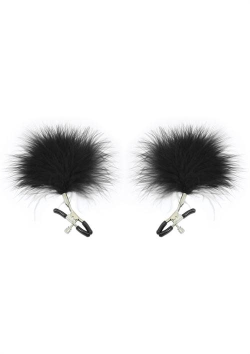 Feathered Nipple Clamps: These Feathered Nipple Clamps feature luxuriously soft feathers that tickle the skin as they sway. This product is available in a sophisticated shade of black. This product is adjustable.