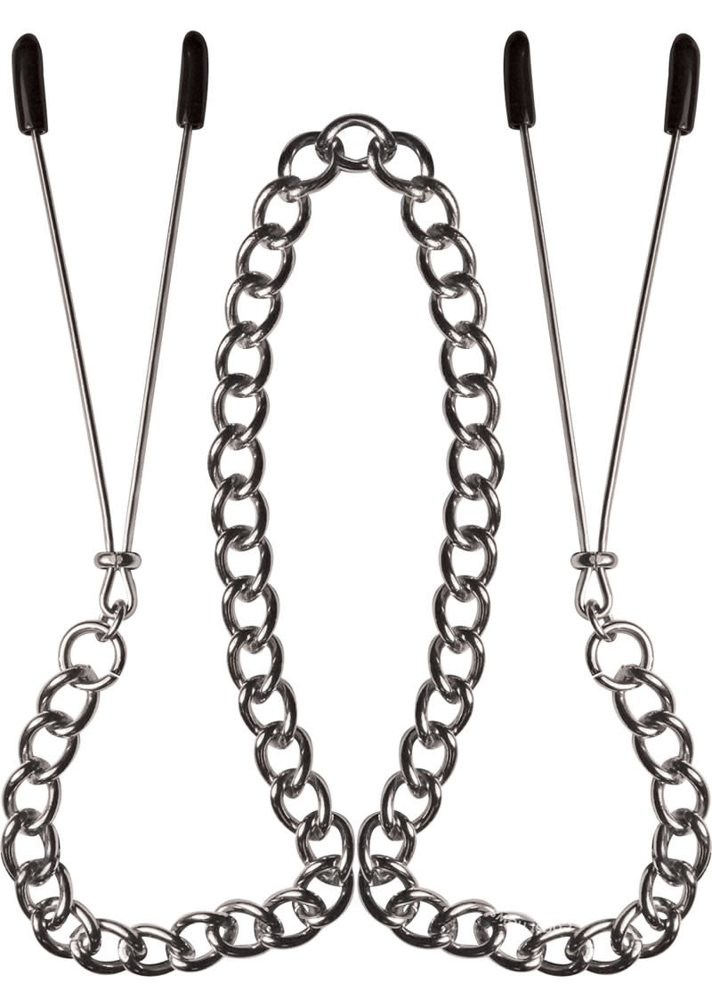 Great for hands free erotic stimulation. Perfect for the beginner. Rings slide down the shaft of the tweezer-like clip for as snug as you like sensations, while the chain drapes across your abdomen. Soft pads at end for added comfort.