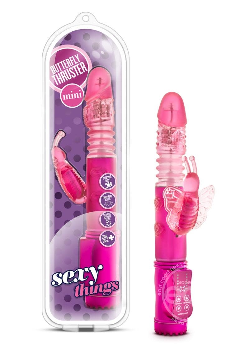 This Butterfly Thruster Mini is anxious to flick, flutter, vibrate and thrust its way straight to your heated cocoon! Featuring reversible rotating pleasure beads and soft sensual gyrating and thrusting shaft, oh don't forget the monarch of a butterfly vibrating your clit! This vibe boosts three times the endless erotic possibilities yet to cum and just screams, come play with me. Made of a Phthalate free soft jelly tpe and is splash proof for quick and easy cleaning. This Butterfly Thruster Mini is just waiting to make butter of your thighs! Requires 4 AAA batteries, not included. We recommend storing your toys in our Safe Sex Antibacterial Toy Bags
