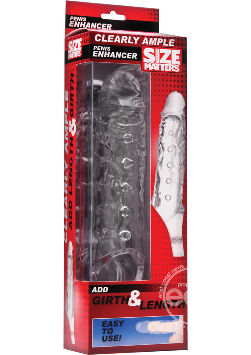 Size Matters Clearly Ample Penis Enhancer Sheath. Men can enjoy a bigger, thicker, longer lasting erection instantly, with no pills, creams, or devices! Simply slip this sheath over your own cock, hard or flaccid, and instantly enjoy your new pleasure rod. Lined internally with pleasure nubs, and featuring a semitransparent design to let your true self shine through, this realistic looking sheath is a great and simple way to be a porn star in your own bedroom! Measurements: approximately 6.5 inches in length, 1.75 inches in diameter at widest point, and an inside diameter of 1.5 inches. Material Thermoplastic Rubber TPR. Color Clear.