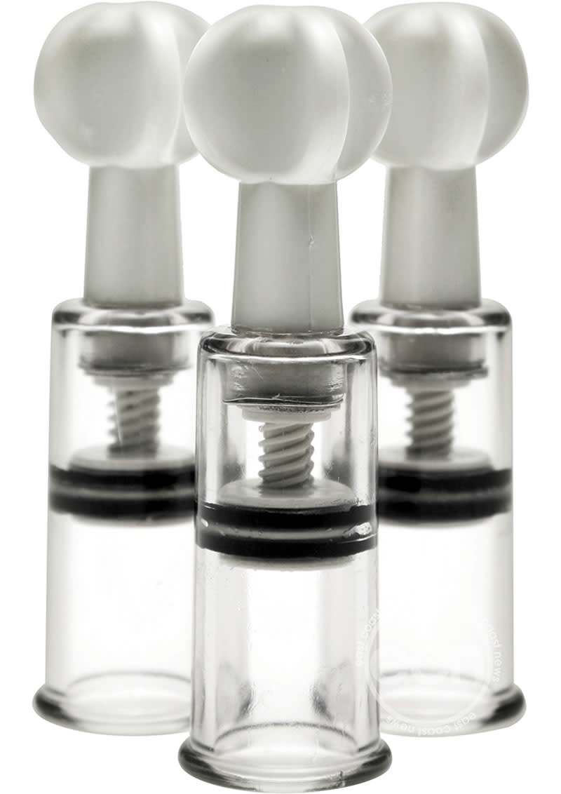 Enjoy powerful suction with this triple set of demurely sized suction cylinders. Just apply to any area that would benefit from increased sensitivity and blood flow, no pumps or accessories needed. These self-contained suction devices work with a simple twist. Silent, simple, and discreet, these suckers can be taken and used practically anyway for on the go stimulation. Lubed internally for smooth movement and a strong seal that makes for sublimely powerful suction.
