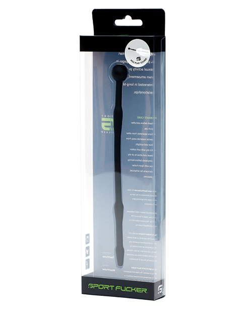 Sounding is quickly becoming one of the fastest growing fetishes among men. You already spend half of your free time rubbin' and tuggin' on your best appendage. Why not stimulate it from the inside? Not into traditional medical play? No problem. With our 100% medical grade premium silicone sounds, your best man and its urethra will thank you! All the metal benefits of an ultra-smooth surface and ability to sterilize without the cold, non-bending attributes of a traditional metal sound. Here's a plug to use with a friend........or on a friend! Do you or your friend have an overly cocky-cock which you'd like to tame? This sound will do it. With an insertable length of 7 ¼ inch, this hollow plug will run the entire length of the shaft and stay there ready and waiting for your load to shoot through. If you're used to shooting big explosive loads all over the place, get ready to be taken down a peg or two as you watch your massive load slowly dribble out the top. Your orgasm will feel twice as intense with this fucker in. But your man juice will just dribble out. The mind fuck of the slower cumming and more intense orgasm will blow your mind as you blow your load! Be sure to only use these great toys with sterile lube. Material: 100% medical grade premium silicone Dimensions Length: 18.415cm. (7 ¼ in.) Ball: 15.5mm. (.61 in.) Back two humps: 8.7mm. (.34 in.) First hump: 8.2 mm. (.32 in.) Internal hole: 3.5mm. (.14 in.)